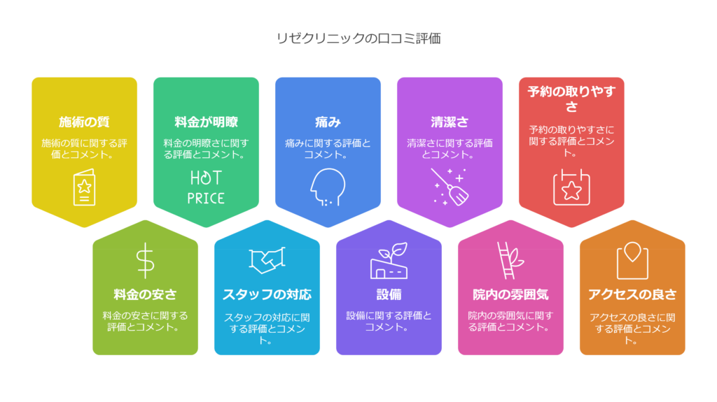 リゼクリニックの口コミを徹底調査した結果、「予約の取りやすさ」「料金の明確さ」「スタッフの対応」という3つのポイントが特に評価されていることが分かりました。